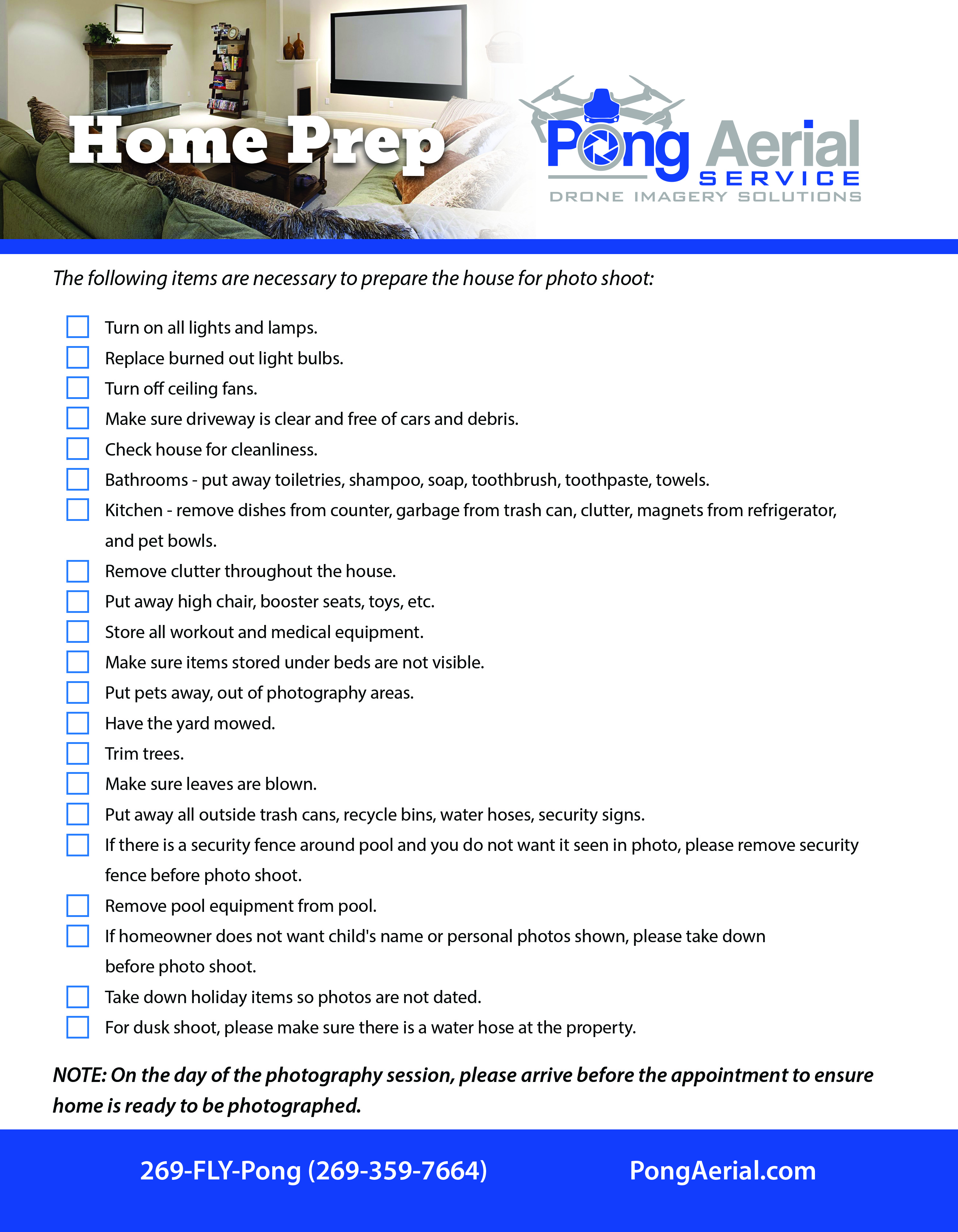 After setting an appointment with Pong Aerial Service, please review the home preparation flyer to ensure your property is ready for the photo shoot. Here you will see all those requirements for photography